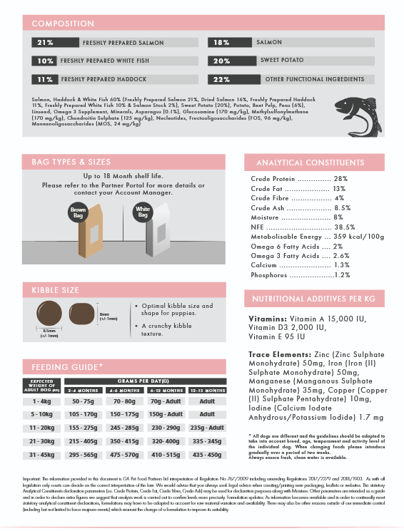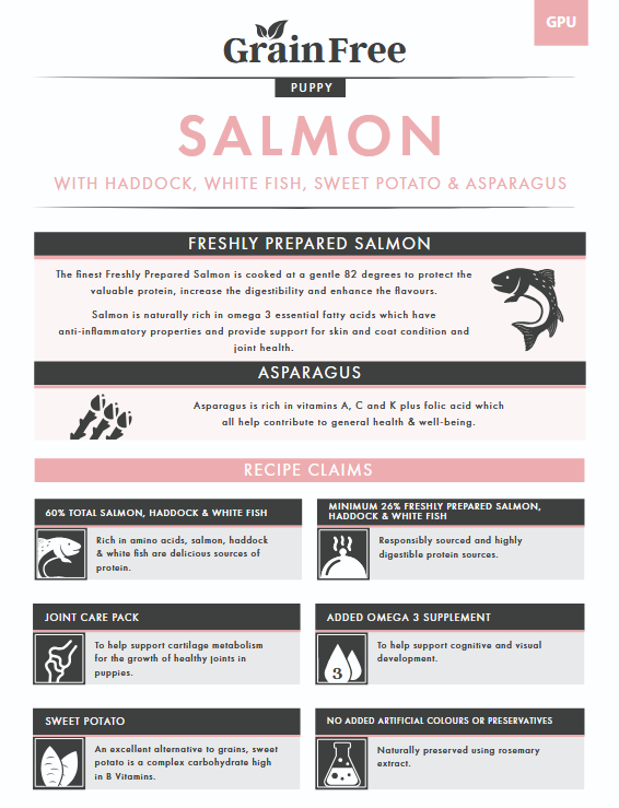Europa Salmon Puppy Food is a 100% natural and grain-free food specially balanced, like no other food on the market, by 60% meat and 40% vegetables, fruit and botanicals. Freshly prepared Salmon is the main ingredient in this recipe, with other lovely ingredients like Asparagus and Sweet Potato, altogether making a delicious dinner for man's best friend. With reduced carbohydrate levels due to no nasty cereals or grains, Europa dog food makes the perfect complete and balanced diet for all breeds of puppies.