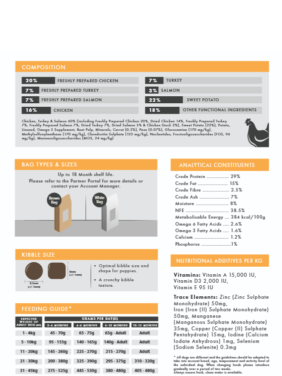 Europa Puppy is a 100% natural and grain-free food specially balanced, like no other food on the market, by 60% meat/fish and 40% vegetables, fruits and herbs. Freshly prepared chicken is the main ingredient in this recipe, with other lovely ingredients like turkey, salmon, peas, carrot and sweet potato, altogether making a delicious dinner for man's best friend. With reduced carbohydrate levels due to no nasty cereals or grains, Europa dog food makes the perfect complete and balanced diet for all puppies all sizes.